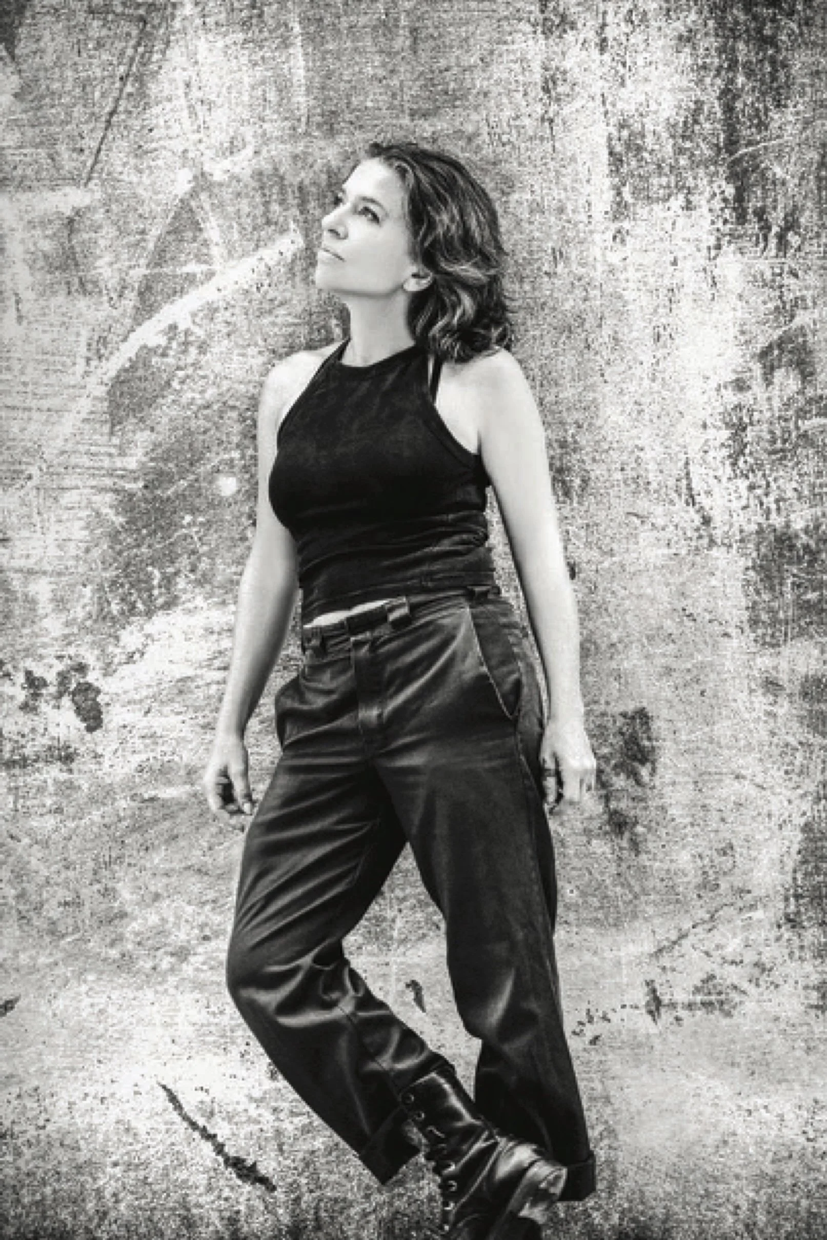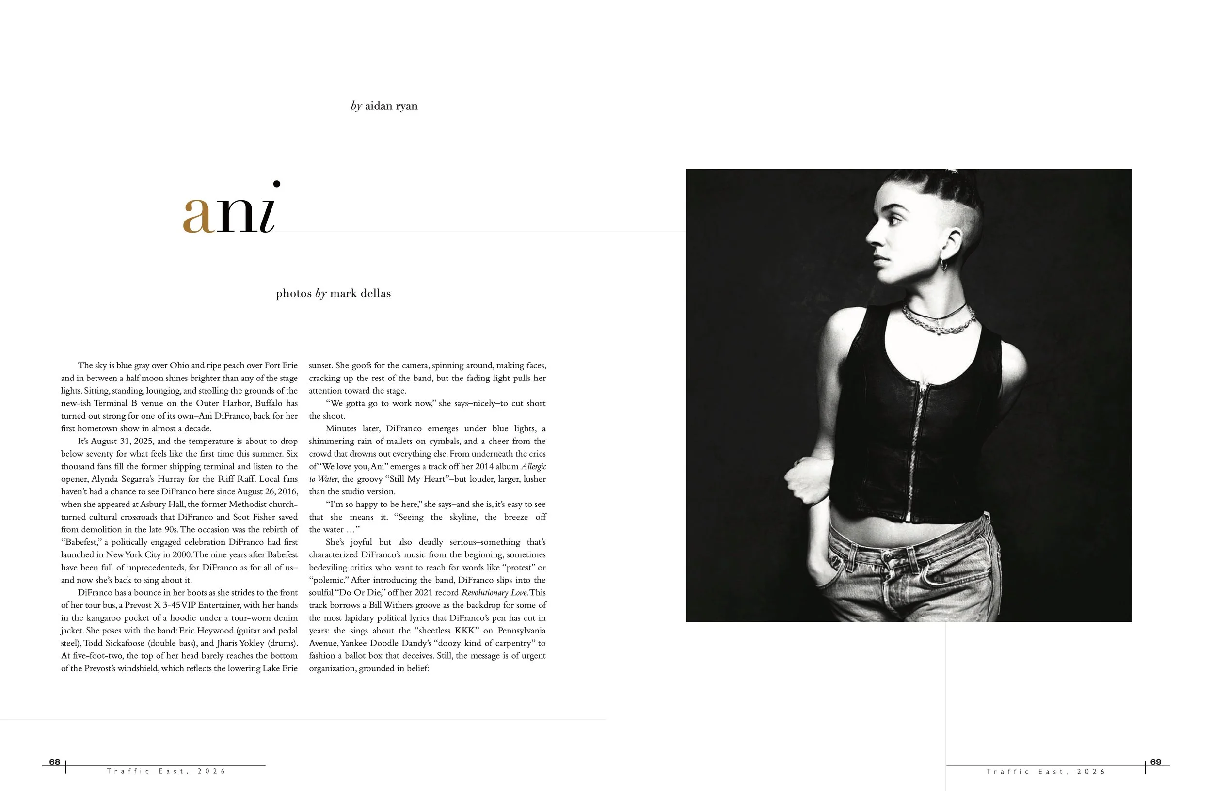 DiFranco has a bounce in her boots as she strides to the front of her tour bus, a Prevost X 3-45 VIP Entertainer, with her hands in the kangaroo pocket of a hoodie under a tour-worn denim jacket. She poses with the band: Eric Heywood (guitar and pedal steel), Todd Sickafoose (double bass), and Jharis Yokley (drums). At five-foot-two, the top of her head barely reaches the bottom of the Prevost’s windshield, which reflects the lowering Lake Erie sunset. She goofs for the camera, spinning around, making faces, cracking up the rest of the band, but the fading light pulls her attention toward the stage.